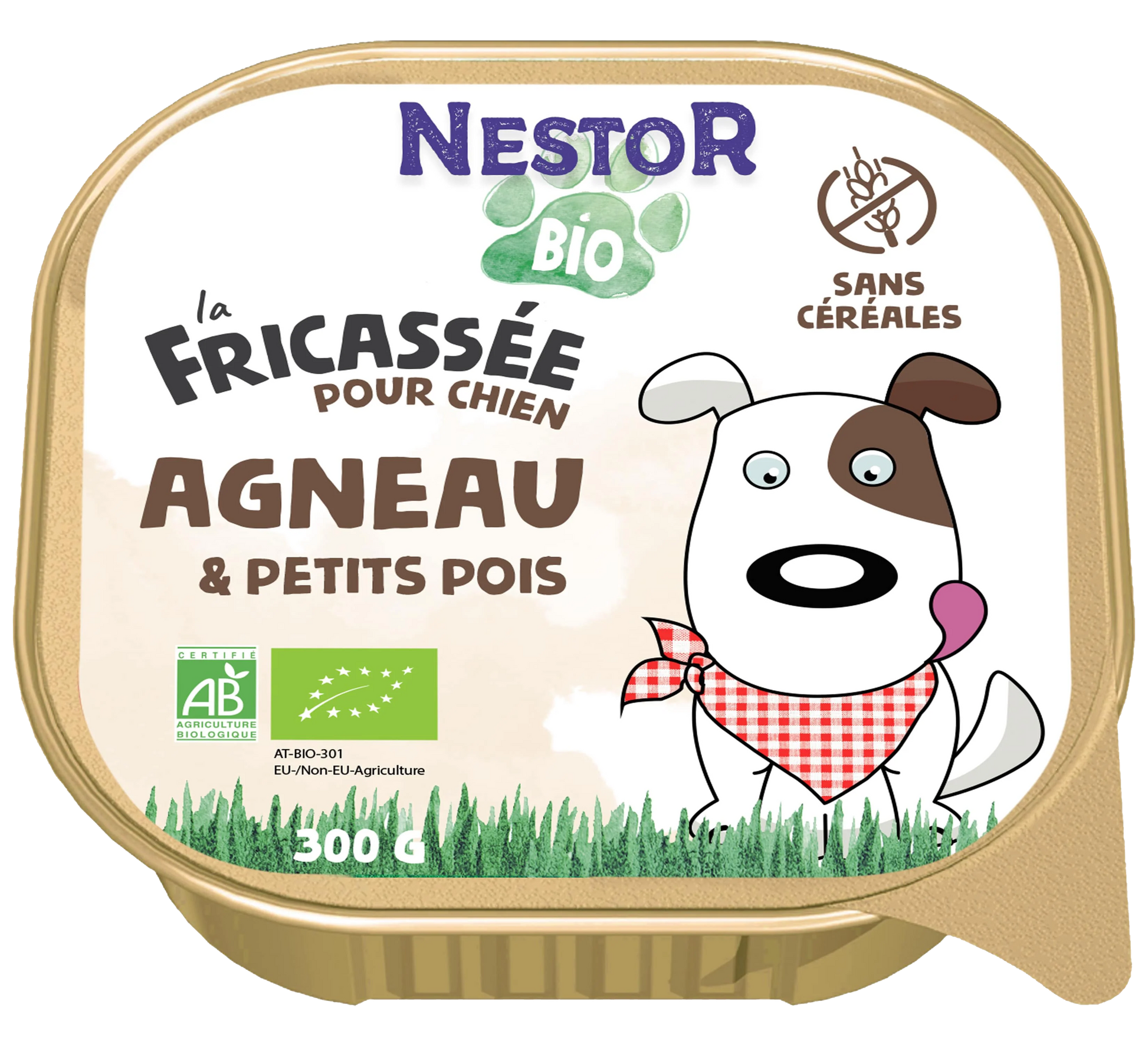 Fricassée bio et sans céréales à l'agneau et aux petits pois fabriquée en France. Recette délicieusement parfumée qui facilite la digestion de votre chien grâce à une cuisson lente. 100% bio, les pâtées Nestor sont garanties sans pesticides, sans colorants ni arômes artificiels et sans additifs chimiques.